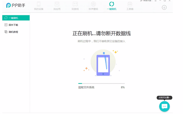 可以降级的第三方工具有很多,这里以pp助手为例。首先用电脑打开pp助手,手机连接电脑之后,点击顶部的刷机越狱功能,进入页面后点击右侧的一键刷机功能,选择好要降级的固件,点击下载,下载好后点击立即刷机,