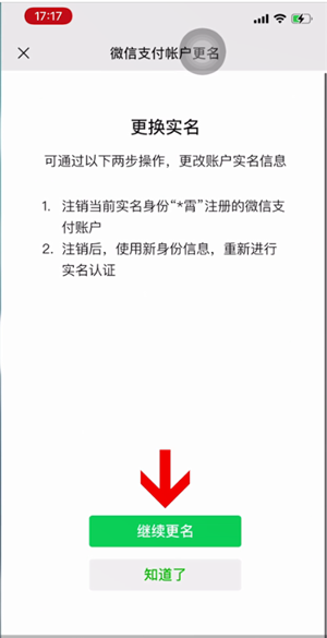 然后点击继续更名,注销完成后即可使用新身份信息重新进行实名认证。