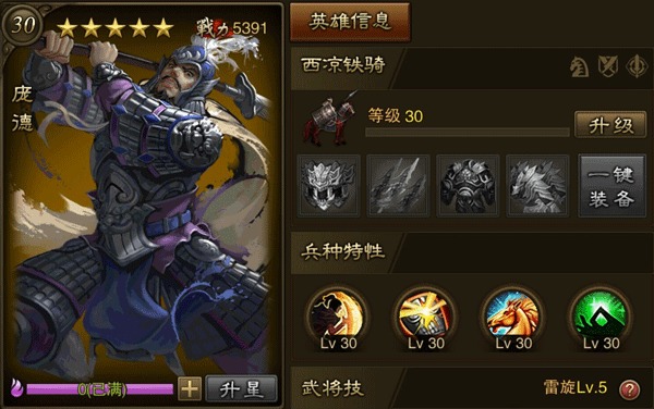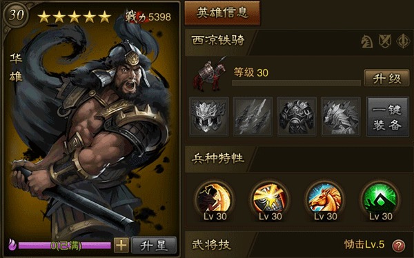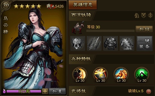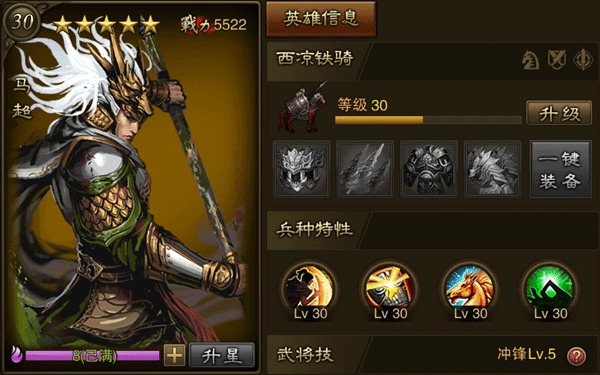 【保养】:每回合行动前自动恢复受损兵力。可以说,骑兵达到了金色品质就开始脱胎换骨了,“保养”一出,西凉铁骑的生存能力和持续战斗能力大大加强了。