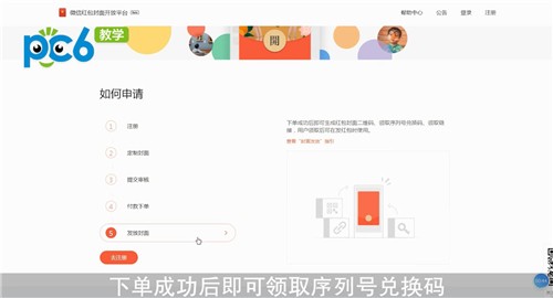 首先在浏览器上打开并进入“微信红包封面开放平台”,然后点击【去定制】,接着根据页面提示依次完成注册、定制封面、提交审核、付款下单的操作,下单成功后即可领取序列号兑换码。
