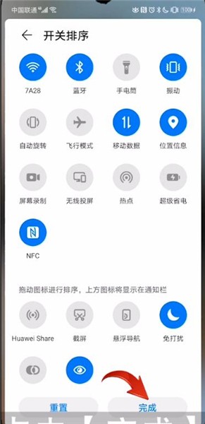 接着拖动图标进行排序,将下方未显示的图标拖动至上方即可在通知栏显示,最后点击【完成】即可。