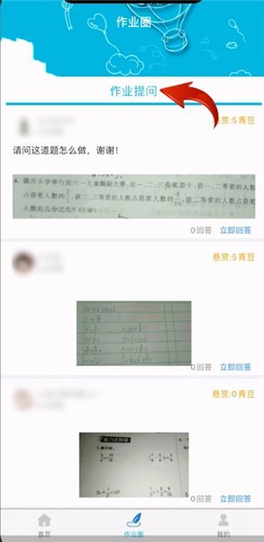 作业精灵拥有百度知道一样的在线问答系统,只需要上传习题就会有各路大神为你解决,只要打开【作业精灵】,进入作业圈,然后点击作业提问,你的问题就会显示在问题栏,也可加上悬赏加速回答速度。