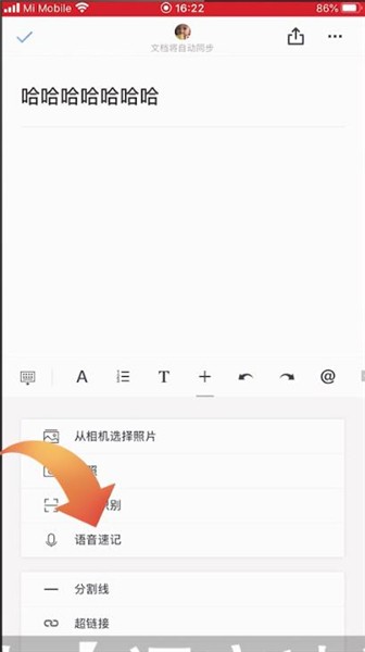 首先打开【石墨文档】客户端,然后点击进入一个文档,接着点击要添加文字语音的位置,点击下方的【+】图标,点击【语音速记】,