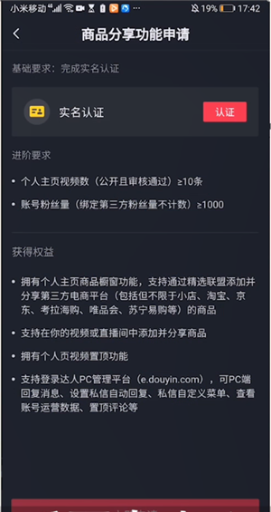 然后点击商品分享,在商品橱窗点击商品分享权限,进行实名认证之后再点击立即申请就可以了。