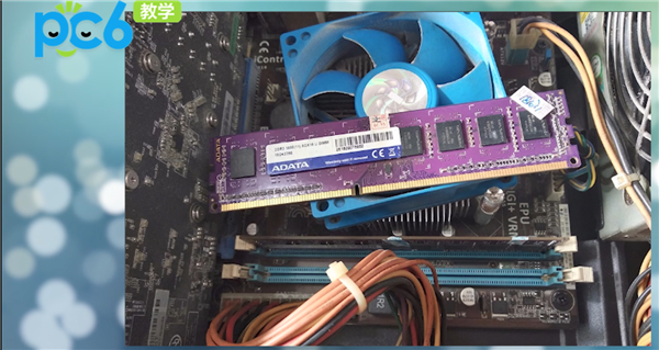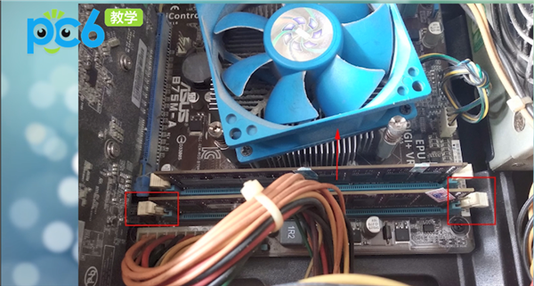 接下来在主板上找到内存条,仔细观察内存条两端是有卡子固定住的,