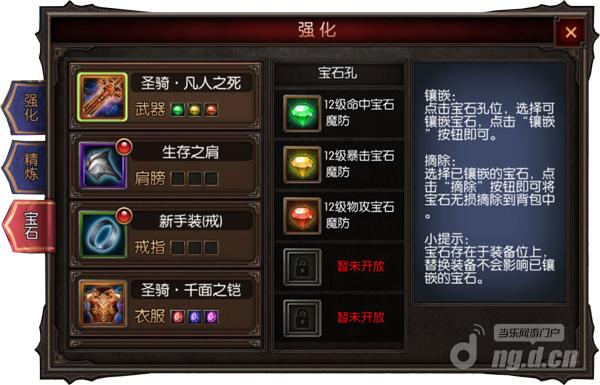 宝石镶嵌可以大幅提升装备的属性,激增战力,不过要注意的是,每个装备位置可镶嵌的宝石属性不同。3个低级宝石可以在炼金里合成1个高级宝石,成功率是100%的呢。妈妈再也不用担心我买不起高级宝石了。