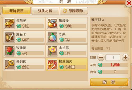 猴王怒火在商场→新鲜玩意→就可以看到了猴王怒火,一个1800仙玉。