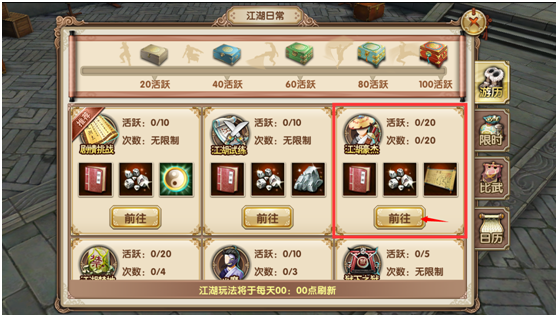 点击“江湖日常”在“游历”选项卡中找到“江湖豪杰”点击前往参与玩法。