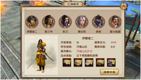 该玩法中有若干江湖豪杰可供选择,豪杰神出鬼没,需要杀死80个豪杰随从后,才能引出豪杰进行击杀。击杀豪杰可获得装备图纸奖励,每位豪杰每天仅可击杀5次。