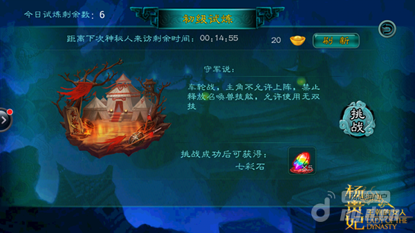 又比如长坂坡试练,在这里要求的是一夫当关,万夫莫开的勇武,在进关卡之前会让玩家选择上阵伙伴的先后顺序,最多可派遣3名小伙伴,主角是不允许上阵的也不能释放召唤兽技能,虽然不能上阵但可以释放无双技哦!进入之后一次只能上阵一个小伙伴来防守怪物们的进攻,怪物们展开三轮进攻,实力强横的您可以打出横扫千军之势,也可以使出田忌赛马之计,总之战斗所用回合越少奖励越丰厚,挑战成功奖励七彩石(主要用途:在锻造界面中洗练装备的品质属性)
