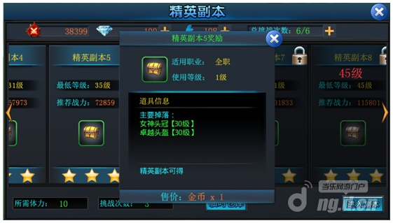 精英副本是我们必须攻克的难关,因为精英副本除了可以锻炼操作技术之外,还很大机率掉落女神装备和人物使用的卓越装备,是除装备合成外,收集卓越装备的最有效手段,在副本选择界面,点击图示宝箱,我们还能预览可能掉落的装备部分。