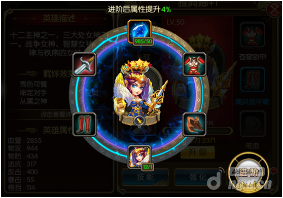 在《尖叫女神》中,英雄有两种提升方式:进阶和强化。英雄进阶需要穿戴满本阶的装备。英雄品阶由低到高依次为:白色、绿色、蓝色、紫色、橙色、金色。英雄进阶后所有基础属性都能得到大幅度提高,英雄卡牌颜色也会变化!除此之外,英雄进阶还能解锁新的被动技能哦。英雄进阶装备使用进阶石从进阶商店换取。