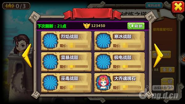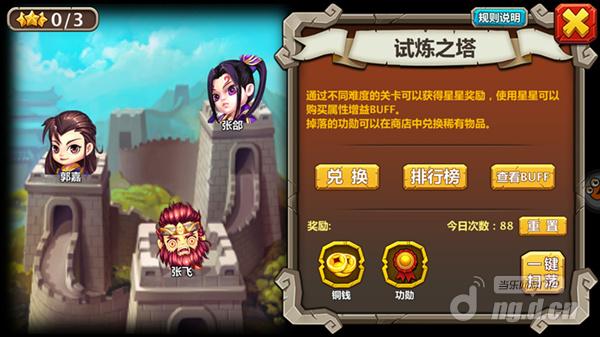 《乱斗三国志》里,玩家每天可在“试练之塔”进行爬塔闯关。爬塔层数按每3个关卡为1层,每挑战一个关卡获得一定数量的战鼓碎片和评星,每层通关后可消耗获得评星数量购买增益BUFF,每层的3个关卡都有通关要求,为满足通关要求即使怪物全灭也算关卡失败。例如:80秒内通关关卡判定胜利,存活武将不少于5个。