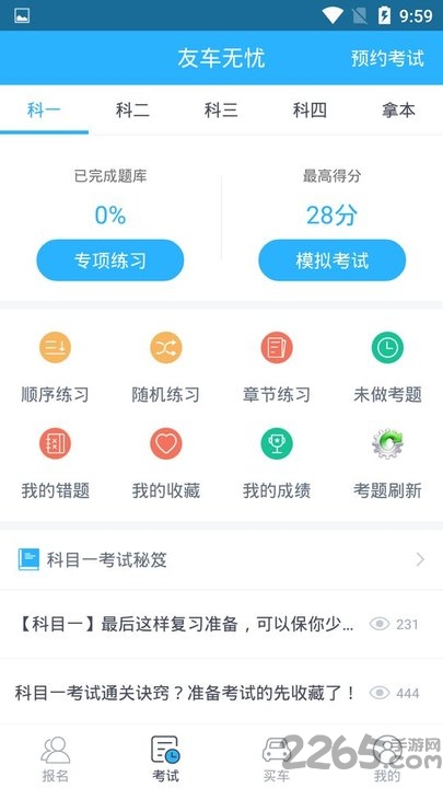 友车无忧是最新的驾考APP。能够快速的同步官方驾考科目一,科目四题库,并对题库进行详细分类整理,方便学员更好的系统性学习。对于科目二和科目三的练车训练,学员可以在友车无忧APP中选择教练,预约练车训练的时间。让学员能够更方便,更轻松的进行练车训练。此外还有各种有关科目二和科目三路考秘笈,学车视频等。