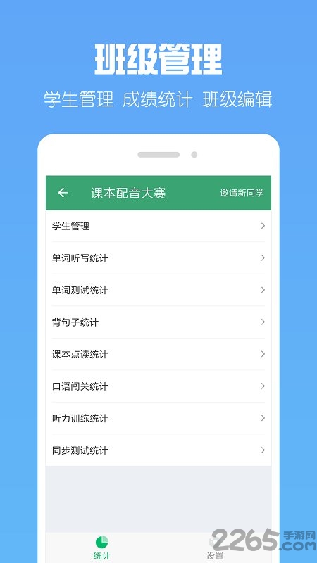 ▼班级统计:支持单词听写、单词测试、背句子、点读统计。