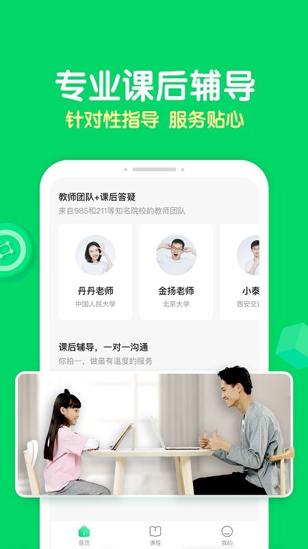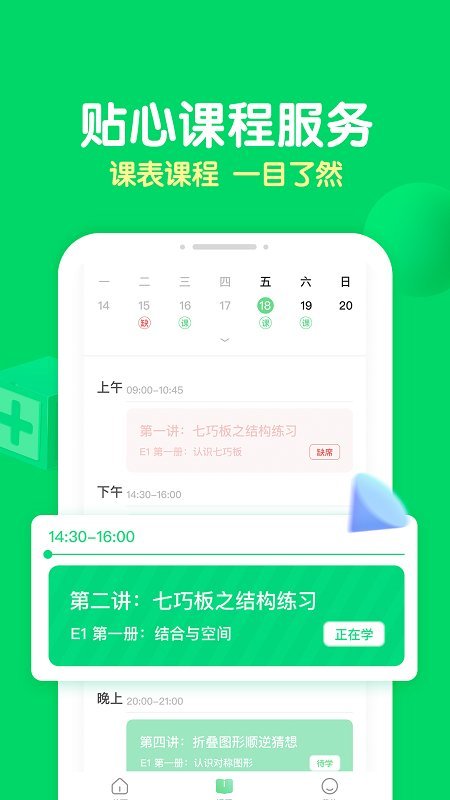 为少儿教育提供多种课程,适合幼儿园以及小学生使用,家长可以在软件选择满意的课程购买,线上即可迅速观看到课程内容,查阅到孩子的上课记录,浏览即将上课的安排,所有的课程安排一览无余,定制200余种精美教具,借助双场景直播系统,提供交互式课堂体验,让学思维像做游戏一样快乐。