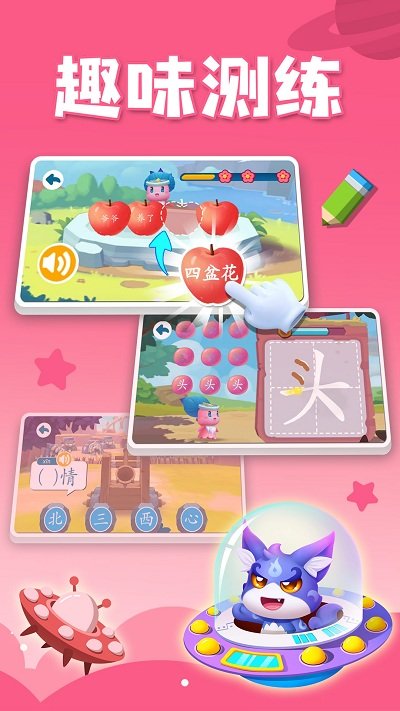 --精灵训练:精心设计充满童趣的精灵训练游戏,包括雪地捞鱼、拼桥渡河、气球消消乐、水果排排队等,孩子在开心的游戏中巩固汉字记忆,保持学习热情,培养思维逻辑。