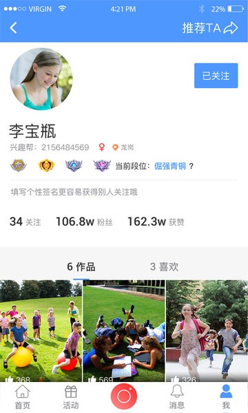 才艺挑战项目,老师发布的学员视频,孩子们可以对学员展示的才艺发起挑战,在限定时间内获得点赞数多余学员视频则挑战成功,获得荣誉勋章。
