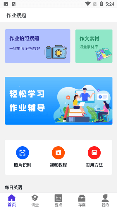 小学、初中、高中各年级各学科题库覆盖,各种题型可供课后练习、作业辅导,学习小帮手;更有英语短信、作文素材,可供学习之用,是您学习必备工具。题目拍照搜索解析软件,作业拍照搜题,一件拍照轻松搜题,视频解析让你学习解题方法;还有海量作文素材,每日英语短文推荐赏析。