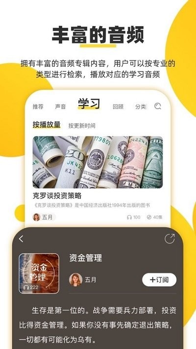 拥有丰富的音频专辑内容,用户可以按专业的类型进行检索,播放对应的学习音频