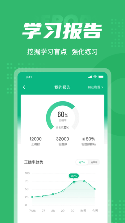 3.成绩单实时记录考试数据,一点一滴的反馈考生近期学习状态以及自我正确率的提升,大大的给予考生通过考试的信心。