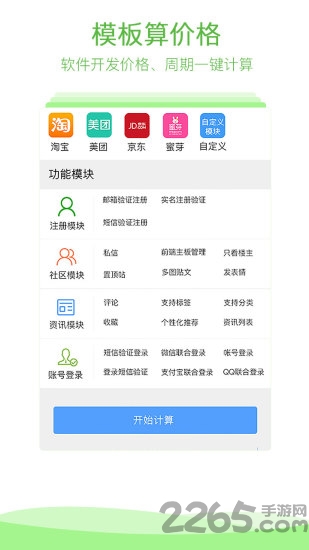 『找外包』之算价格:将常用软件功能细分化,用户可根据自身需求选择自定义功能计算价格与周期,并针对传统行业用户推出一键式模板计算软件价格与周期的功能。