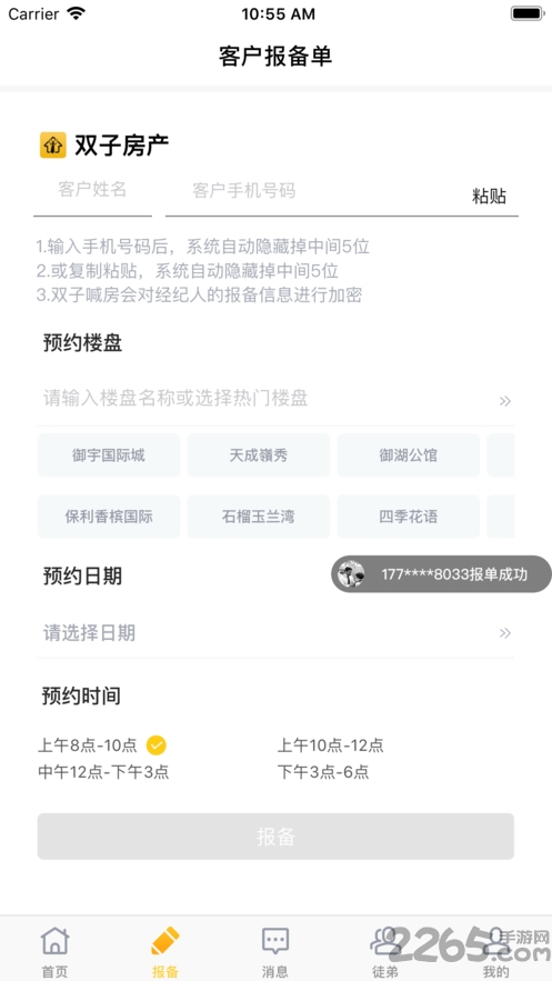 2.一键报备全楼盘,不在浪费重复时间,线上协助一条龙销售流程!