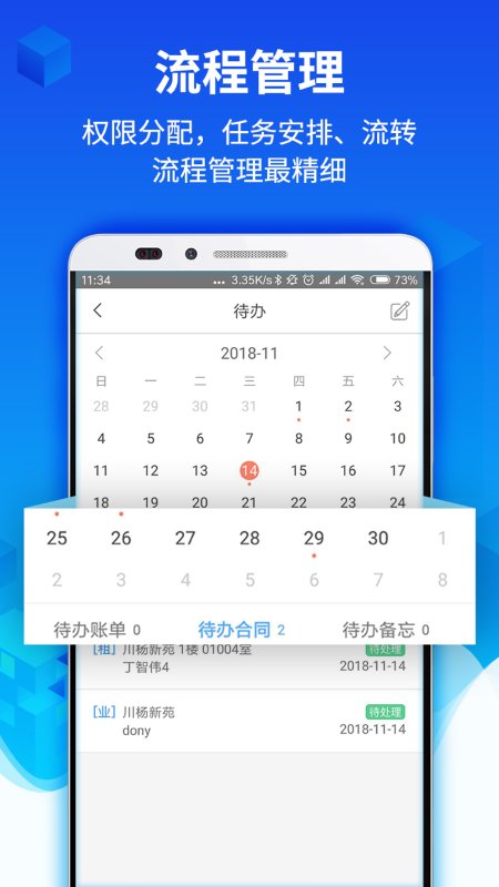 3.日程管理:待办账单/合同/备忘录,日历面板控制。