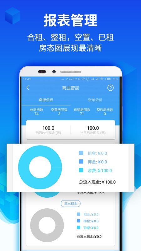 2.经营指标统计:入住率/续租率/退租率/利润率,实时统计,经营数据一目了然。