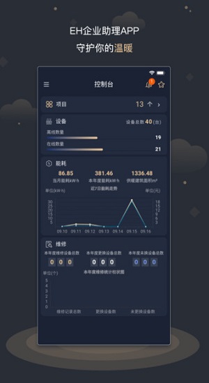 eh企业助理app主要是智能供暖助理,功能齐全,数据清晰,可方便随时在线看供暖的信息,包括温度以及分控统计,人客户拥有更安全、贴心、便捷的平台,专业的服务让企业供暖更舒心,企业的必备软件不要错过哦