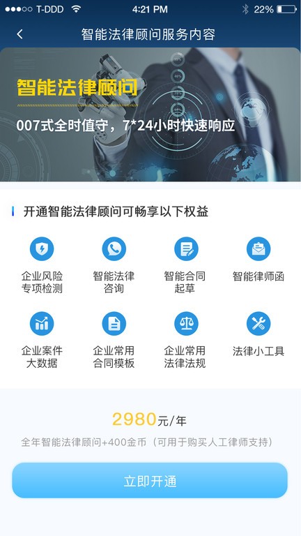 4.拥有智能法律顾问服务,用户开通后可以享受到多种法律权益,提高服务质量;