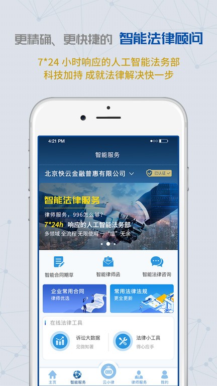 云律通法务管家是一个为企业提供各种法律服务的软件,帮助企业解决各种法律问题,将风险体检、大数据案例分析、法务档案管理、智能服务、律师服务、法务资讯看板、多种实用法律工具和全程客服支持集成一体,轻松获得法律专业团队的鼎力支持.