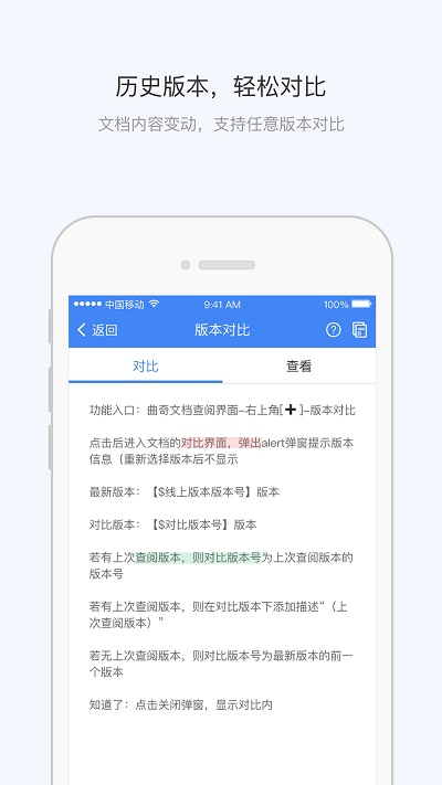 【版本对比】文档修改支持版本对比,您不需要每次都全部看一遍,只需查看新文档和上次看过文档的异同