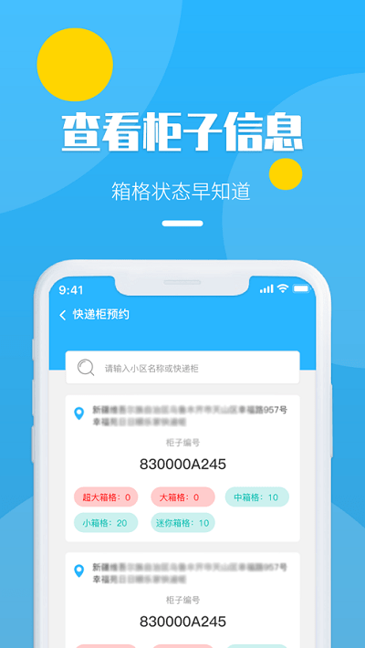 辅助快递员管理快递柜的软件,提前预约箱格,避免快递柜无箱格可用,你可以查询每一个快递柜的信息,支持同个柜子多个快递员用app同时投递,24小时自由自在,自助服务。