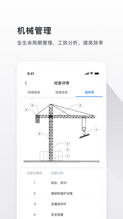 3.为用户提供机械管理版块,用户可以看到机械设备详细信息,了解指导表内容;